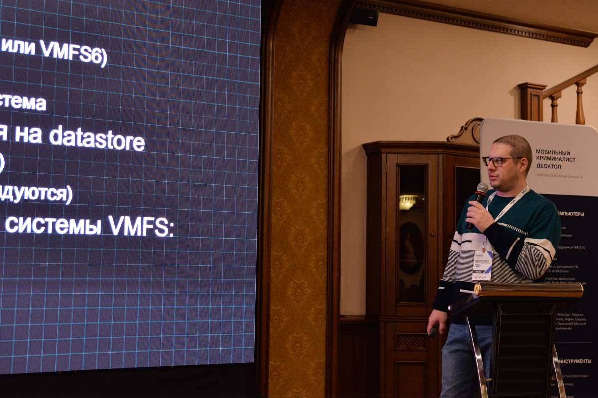 Дальнейшее обсуждение вышло за пределы отдельных устройств и приложений и затронуло более сложные цифровые среды. Максим Суханов (CICADA8) выступил с докладом об особенностях расследований в виртуализированных инфраструктурах на базе VMware ESXi. Такие системы объединяют множество виртуальных машин и сервисов, поэтому при расследованиях особое внимание уделяется хранилищам данных и системным журналам. Спикер уделил внимание тому, где именно в такой инфраструктуре искать следы активности, анализ которых помогает восстановить события, происходившие в инфраструктуре, и понять, какие действия выполнялись в системе.
