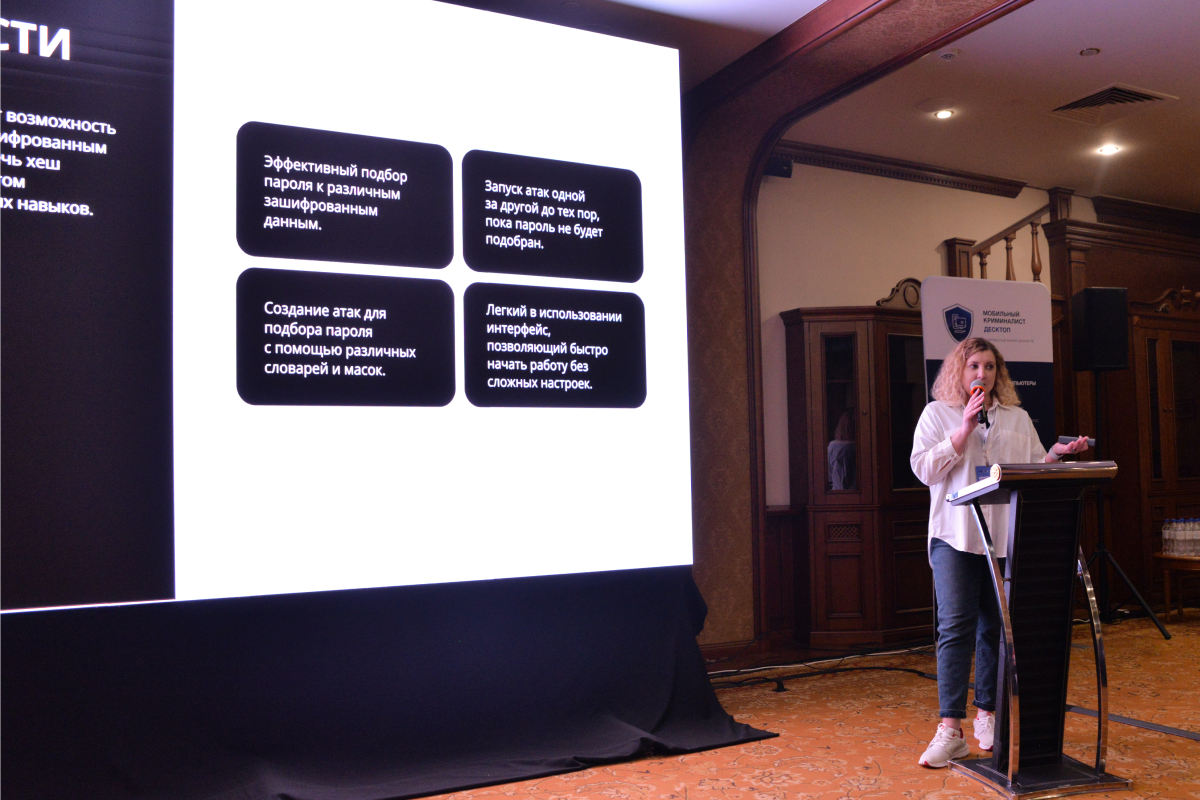 Серию выступлений открыла Валерия Вахрушина («МКО Системы»), которая рассказала о практических задачах подбора паролей при работе с зашифрованными данными. Сегодня специалисты все чаще сталкиваются с архивами, офисными файлами и резервными копиями мобильных устройств, доступ к которым защищен паролем. Одной из ключевых тем выступления стал функционал модуля «МК Брутфорс» в составе ПО «Мобильный Криминалист», который предназначен для подбора паролей и хешей к различным типам зашифрованных данных с использованием вычислительных мощностей видеокарт и центрального процессора.