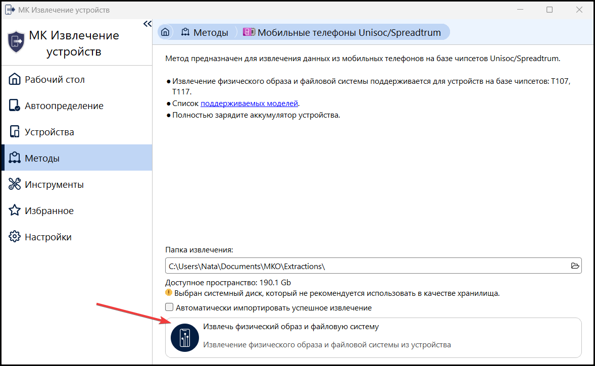 Для начала процесса извлечения следует нажать на кнопку «Извлечь физический образ и файловую систему».