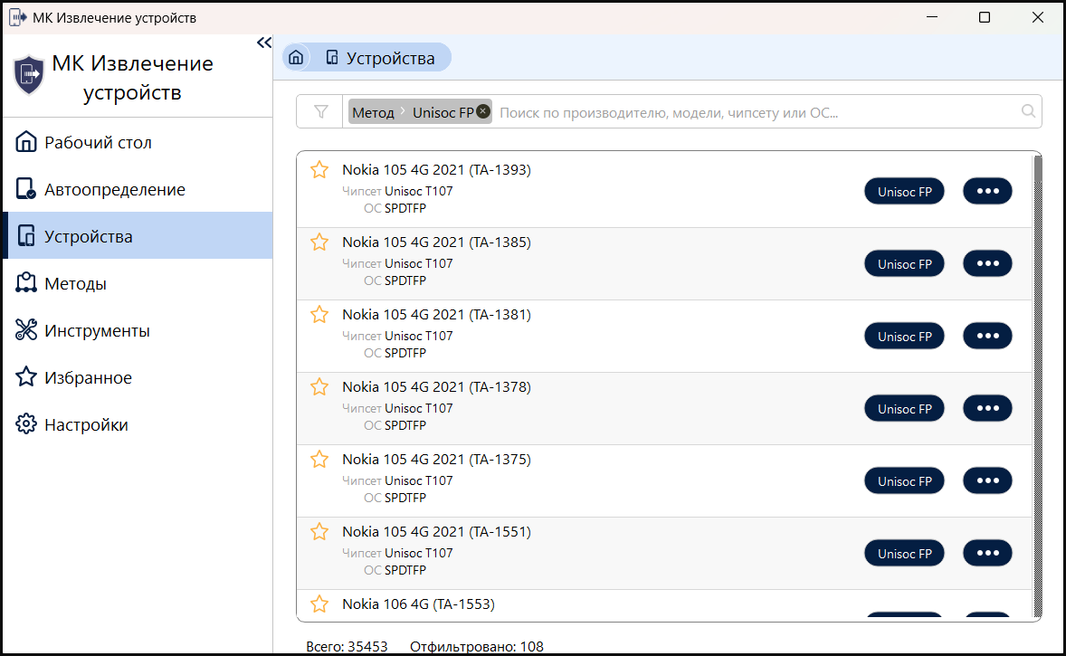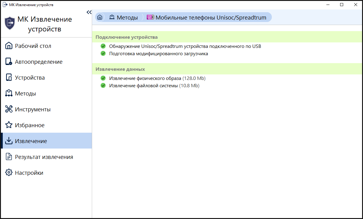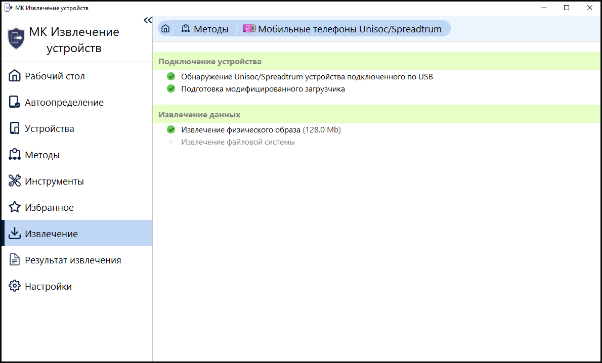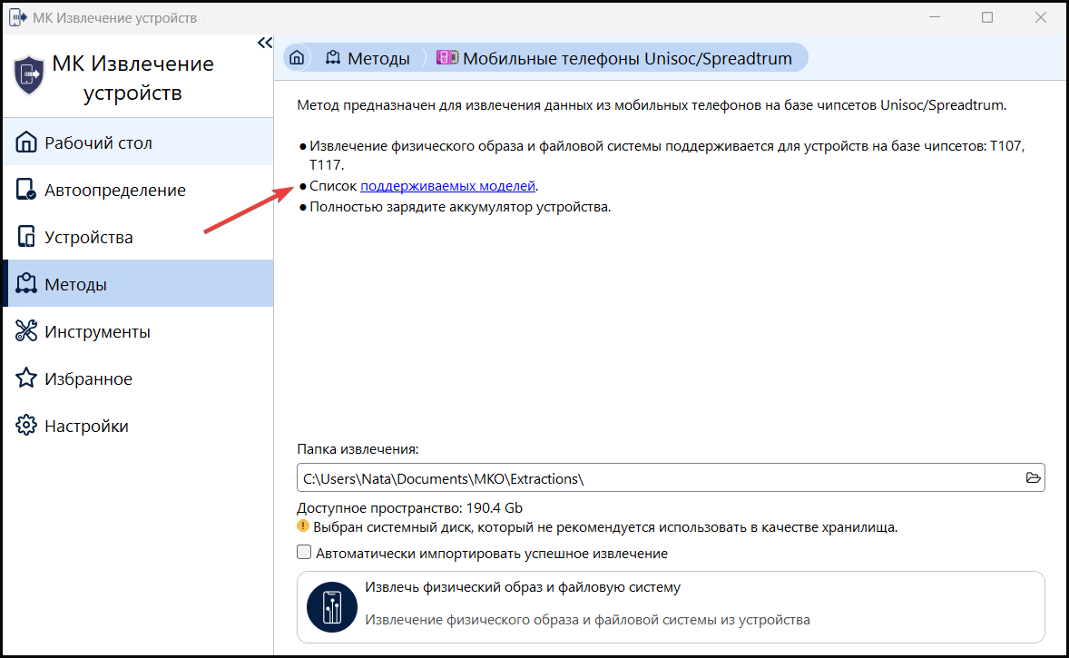 Внимание: список, приведенный на странице метода, носит справочный характер. Отсутствие в нем конкретной модели устройства не исключает возможность успешного извлечения.