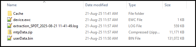 В папке с извлеченными данными должны находиться два файла: mtpData.zip с файловой системой и userData.bin с физическим образом.