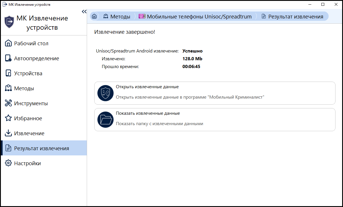 Из финального окна можно открыть извлечение в программе «Мобильный Криминалист» или перейти к папке с сохраненными данными. При этом в статистике отображаются общий объем и время извлечения как для физического образа, так и для файловой системы.