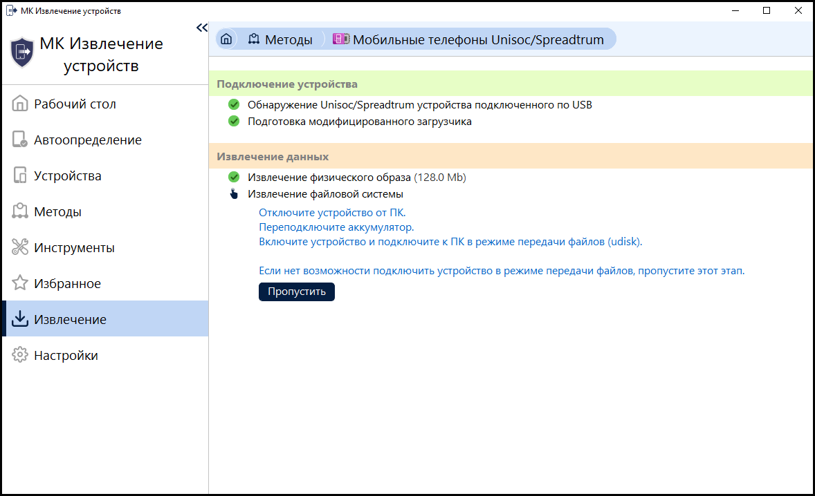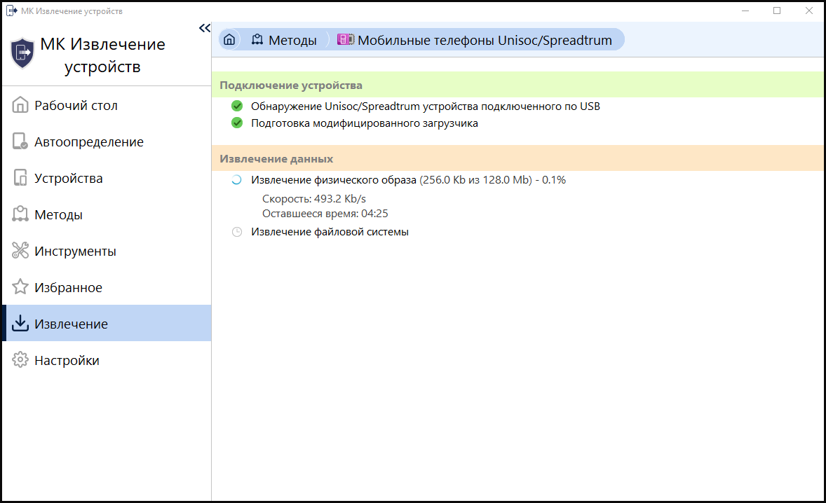 После успешного перевода в нужный режим начнется процесс извлечения физического образа устройства. Дождавшись его завершения, можно переходить к следующему этапу — извлечению файловой системы.