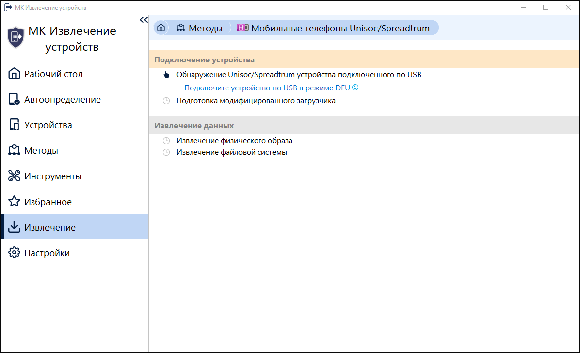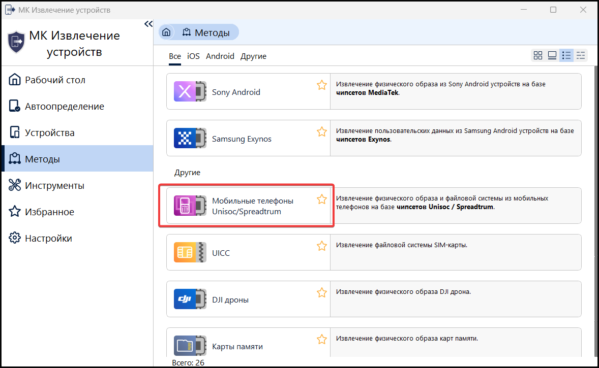 В июне 2025 года в ПО «Мобильный Криминалист» был добавлен новый метод для работы с кнопочными устройствами на базе чипсетов Unisoc T107 и T117. Для таких моделей используется метод «Мобильные телефоны Unisoc/Spreadtrum», который доступен в разделе «Другие» модуля «МК Извлечение устройств». Мы подготовили пошаговую инструкцию, которая поможет разобраться с использованием нового метода.