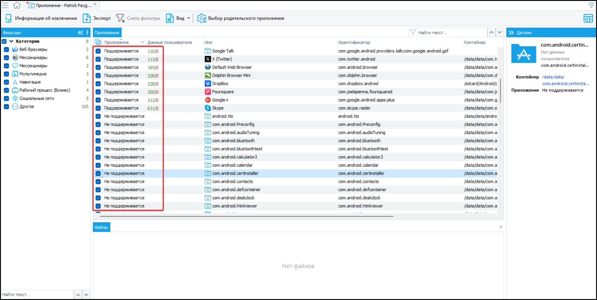 Работа с этим функционалом начинается в разделе «Приложения», где отображается список всех приложений, обнаруженных в ходе извлечения. Теперь каждое из них имеет статус: «Поддерживается» — для поддерживаемых программой, и «Не поддерживается» — для остальных.