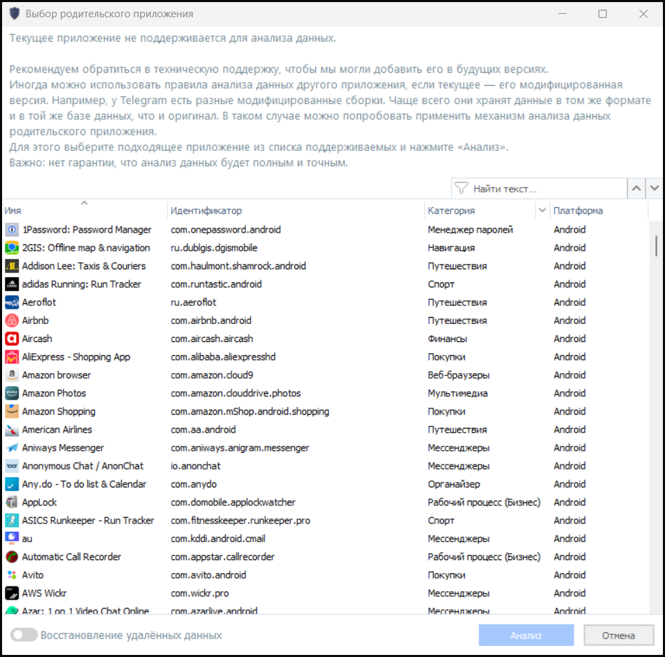 При нажатии на нее открывается окно, в котором предлагается подобрать аналог — приложение, схожее по структуре и входящее в перечень поддерживаемых. Пользователь самостоятельно определяет, какое из поддерживаемых приложений может быть ближе всего к неизвестному. В этом интерфейсе доступны поиск по названию, фильтрация по категориям и платформам, а также дополнительная функция восстановления удаленных данных из неподдерживаемого приложения. При этом важно учитывать, что восстановление удаленных данных носит вероятностный характер.